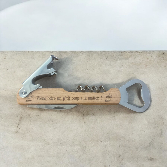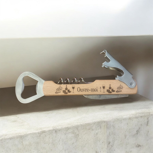 tire bouchons + decapsuleur gravure personnalisé recto/verso
